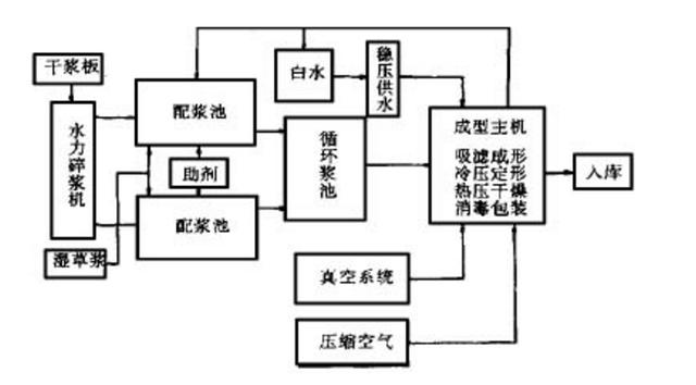 生產(chǎn)線是由兩臺真空模塑成形主機系統(tǒng)和與主機規(guī)模相適應(yīng)的輔助系統(tǒng)所組成, 其生產(chǎn)工藝如下:原料甘蔗漿(干漿或濕漿) 制漿,配漿,輸漿,成型主機(注漿、吸濾成形、熱壓定型、真空熱干),切邊,檢驗,成品消毒、包裝,入庫。